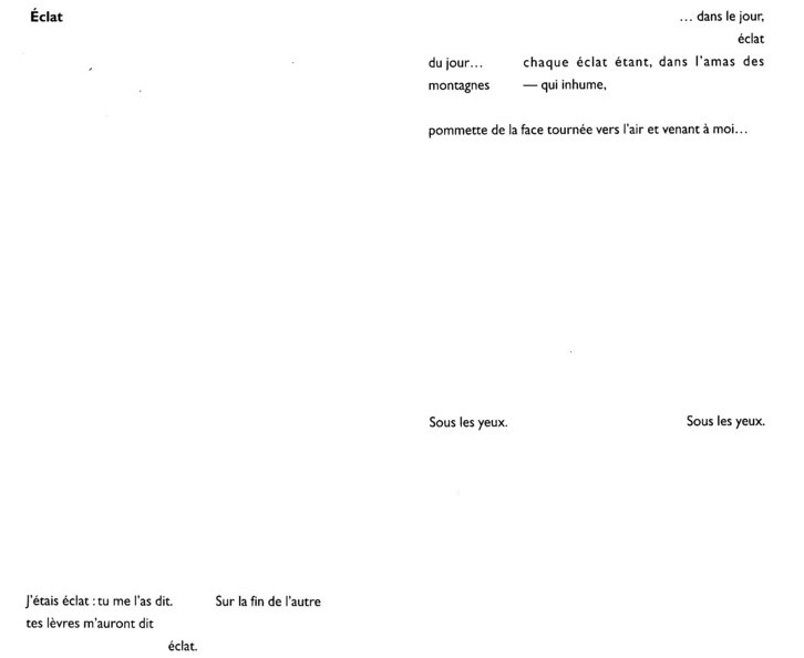 Le blanc n’est pas séparation dans le temps et dans l’espace même il est union, trait d’union [12] , résonance intérieure à la manière d’un non-son en musique et d’un non-mot en poésie. Il est comme un silence, une respiration, un souffle, qui ne fait qu’interrompre un instant le flux d’une phrase entre deux mots sans en marquer l’achèvement.