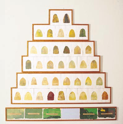 Le mot "page" dérivant en même temps de "pagina", la treille étagée qui porte les raisins de la vigne, de "pagus", le bourg, espace humanisé en bordure des sillons, et de "pango", qui signifie ficher solidement en terre, planter, mettre des bornes, l’espace de la page où a été peint un chapeau par le prétendant n°10, appelé B.M.P.T se présente sous le triple signe de l’organisation géométrique, de la répétition et de la limite.