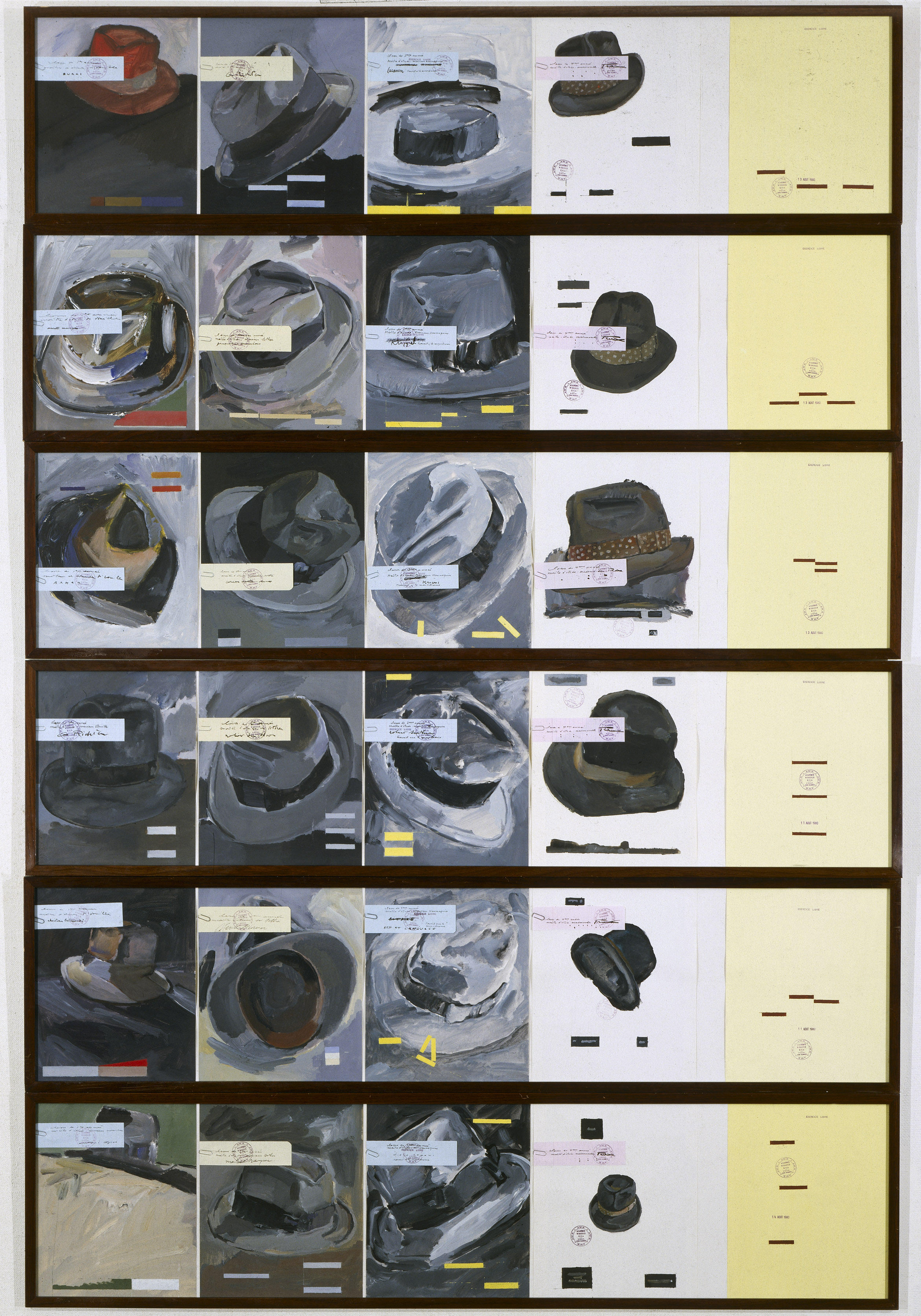 “La forme d’études imposées pour la pratique picturale est bornée sous l’apparence d’un chapeau” . Tous les élèves de l’Académie peindront donc des chapeaux. Et Gasiorowski de s’identifier à la monomanie du professeur Arne Hammer en peignant réellement les œuvres des élèves de l’Académie. Sujet obligé, donc, qui permet de mesurer les écarts de la représentation. Ce faisant Gasiorowski se fixe une limite, peindre autant de chapeaux [1] qu’il y a d’élèves ayant suivi les cours durant quatre années, c’est-à-dire quatre cents. » [2]