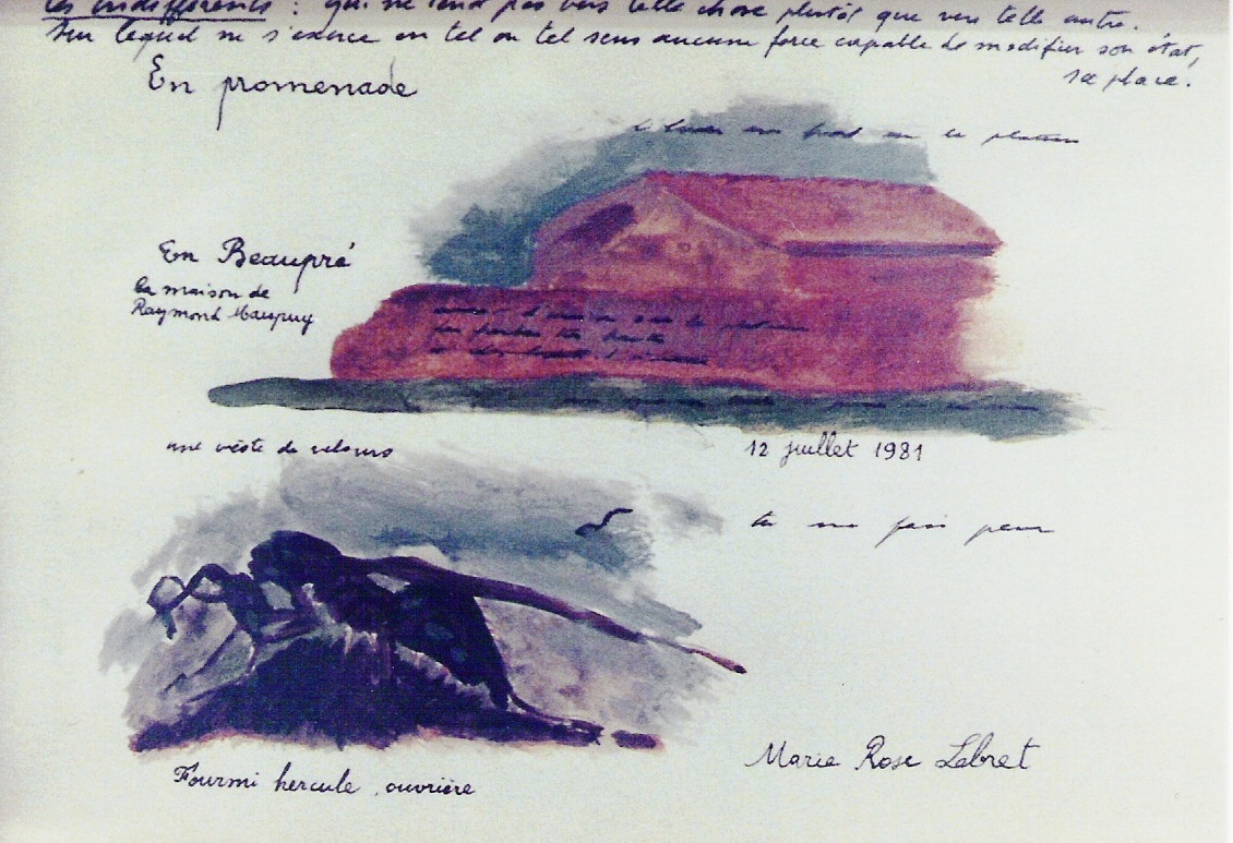 L’espace de la page arrachée à un carnet de croquis spiralé s’impose par la nécessité des mots inscrits sur un fragment de feuille de cahier d’écolier, accroché par un trombone : « cours par correspondance, préparation à l’entrée en classe de première année, maître d’étude : monsieur Vouille, prétendant : B.M.P.T. ». La marque d’un cachet circulaire fait au tampon encreur est également lisible : « Académie Worosis Kiga. Prof. Arne Hammer. A.W.K. »