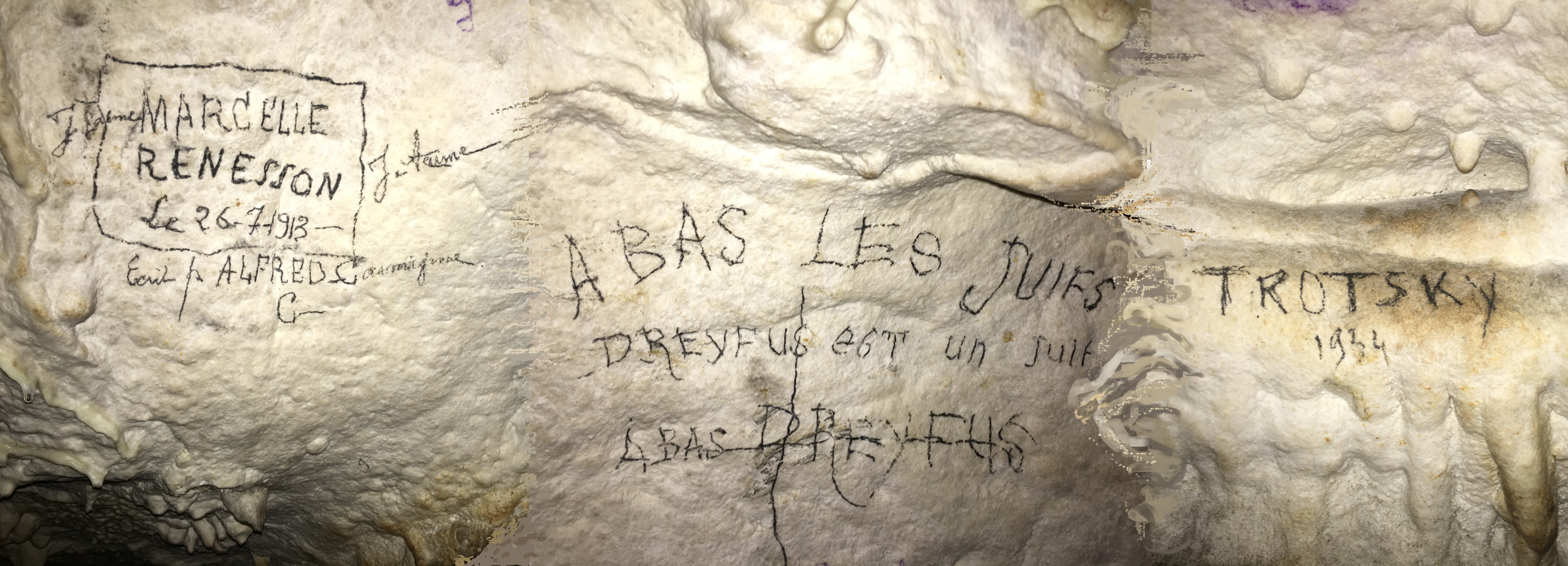impeccable syllogisme qui rappelle que la raison, quand elle se mêle de conduire l’Histoire, peut être sœur de la folie (Baruch, le maître de Livia, qu’elle tentait de m’enseigner à chaque occasion, ne l’a-t-il pas écrit en son temps dans son patois latin ?) Cette paroi est un supplément du Petit Vingtième ; on y lit non loin, sous une inscription violette indéchiffrable : « TROTSKY 1934 ». Supercherie ? Ce n’est pas sûr. À cette époque, le vieux bolchévique a vécu quelques mois à Domaine, près de Grenoble ; il a pu fréquenter le Vercors – quoiqu’on l’imagine mal assez fat pour laisser son nom dans la nuit des grottes, et de plus dans la langue de son exil ; à sa place, par souci de véracité, ou par mélancolie, je l’aurais écrit en cyrillique : ТРОЦКИЙ. Vraie ou fausse, pour un cinéaste ou un romancier, quelle belle scène : l’apôtre de la révolution permanente en équilibre instable sur les roches glissantes, ses lorgnons sur le nez, une lampe à carbure à la main, un éclat de charbon dans l’autre, traçant une à une ses lettres d’une main malhabile (elle semblent d’un enfant, mal formées, de hauteurs inégales, certaines curieusement penchées), sans s’inquiéter de l’inscription haineuse qui souille la paroi – mais, prenant un peu de champ, la caméra la découvre et s’y attarde, et l’on entend quelqu’un la lire avec l’intonation des voix qui se sont tues, endormies dans les rouleaux de cire, vilipendant Dreyfus et Trotski et tous leurs coreligionnaires, comme on disait alors, bien qu’on visât moins la religion que la race, et que celle-ci fût factice, fruit de la culture plus que des gènes... À moins que ce nom ne garde le souvenir d’une aventure occulte… Peut-être, subjuguée par ses yeux myopes et sa barbiche d’apothicaire, une jeune militante l’a-t-elle conduit là pour le divertir de ses travaux sévères, et leurs corps s’étant frôlés dans l’étroit couloir menant à la chambre secrète, y ont-ils buté l’un sur l’autre dans la pénombre, au milieu des vieux aveux, s’accordant en un tournemain, comme une servante et un garçon de ferme échappés de la vogue où ils se sont rencontrés, la montagne se mettant bientôt à soupirer, à gémir, à ahaner, jusqu’à ce qu’un dernier cri s’étouffe dans la nuit.