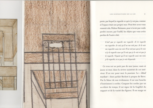 Le texte de Dominique Quélen suit chaque ligne droite - toutes le sont, les verticales, les horizontales -, plonge dans les volumes répartis géométriquement entre les quatre bords de la feuille. Il ne lâche pas d’un mot le dessin silencieux et sans ombre. À quoi œuvre-t-il ? Il observe la façon dont la main fait vibrer l’espace dans la feuille rescapée, comme Helene Reimann, de la disparition et de l’oubli. Les phrases cheminent entre les sept meubles, éprouvent le crayonné gris et marron, se glissent entre les barreaux du dossier de la chaise jusqu’au trou blanc qui perce le bois là où palpite le dessin, un poème.
