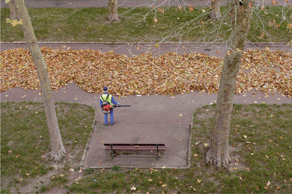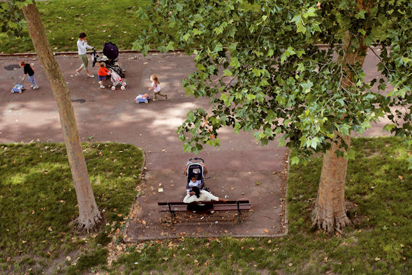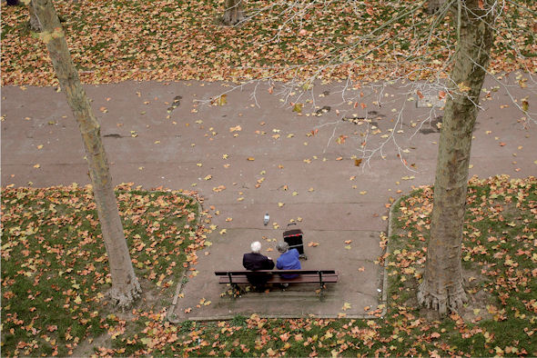 On s’assied un instant ; on entre dans le paysage, on devient soi même élément de la grande nature morte du monde (« still life » en anglais = vie tranquille convient vraiment mieux) et le ciel est traversé de sillages d’avions où on peut voir les lignes de la main du monde, entre les bourrelets en marbre sclupté des nuages… Mais belle amie que je vois rêveuse, je ne voudrais pas vous fatiguer en marchant : souhaitez vous que nous marquions une pose, qu’on s’assoie , tenez, par exemple sur ce banc à l’ombre des platanes comme pour goûter le parfum des feux d’automne sur la ville ?