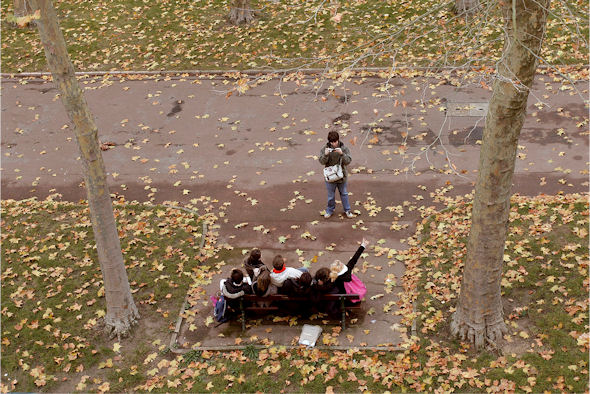 Je connais un ami qui pensait à ça, il rêvassait à la fenêtre du troisième étage, il regardait et c’est comme ça que l’idée du « banc » lui est venue, et ensuite il a fallu plusieurs saisons de travail pour avancer là dedans, sans bien penser au départ qu’il allait faire des rencontres ; Platon (le « Banquet » n’est qu’un repas pris à une table garnie de bancs) Arthur Rimbaud (« à la Musique ») Prévert (« le désespoir est assis sur un banc ») et naturellement Brassens. Un autre créateur avait eu une idée voisine, il y a longtemps : regarder le monde de haut, mais c’était l’enfer alors il y a mis l’homme et la femme ; un arbre, un Jardin, et sans doute un banc, maintenant vous voyez peut-être ?