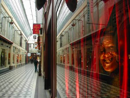 A force, les galeries finissent par se ressembler, les horloges marquent presque la même heure, mais avec quelques minutes de décalage en fonction de la progression du piéton. Si l’on est encore à Paris, il peut s’agir aussi bien d’un univers de scenic-railway, d’un décor de cinéma resté muet, où le Bonheur des Dames est toujours proclamé, au coin d’une devanture, à son acmé.