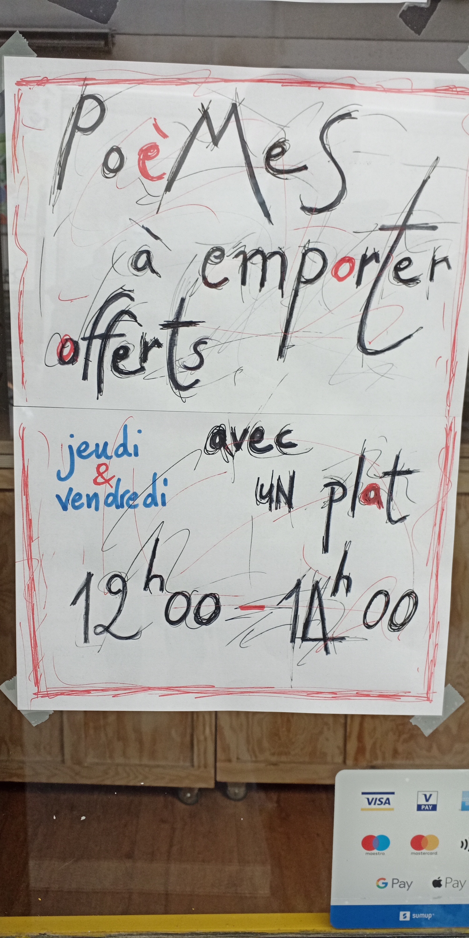 Avant le confinement, elle proposait des plats à emporter : à côté du comptoir pour la distribution des repas, Edith Azam et Pierre Soletti ont pris place pour improviser des "poèmes à emporter" qui ont accompagné les plats...