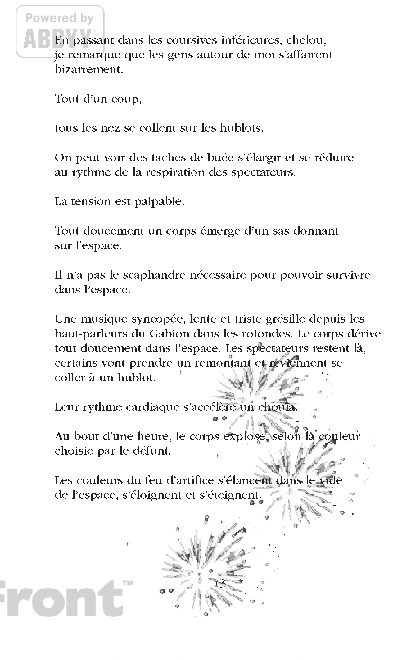 Le Gabion est un texte qui parle de ce que le langage nous fait, une chanson de geste, à travers les entrailles d’un vaisseau à la dérive dans l’hyper-espace. Où on essaye d’être vraiment extraterrestre et d’échapper au pouvoir des mots, à l’aide du chuchotement, de la mise en page, de la poésie et de la transe-zombie.