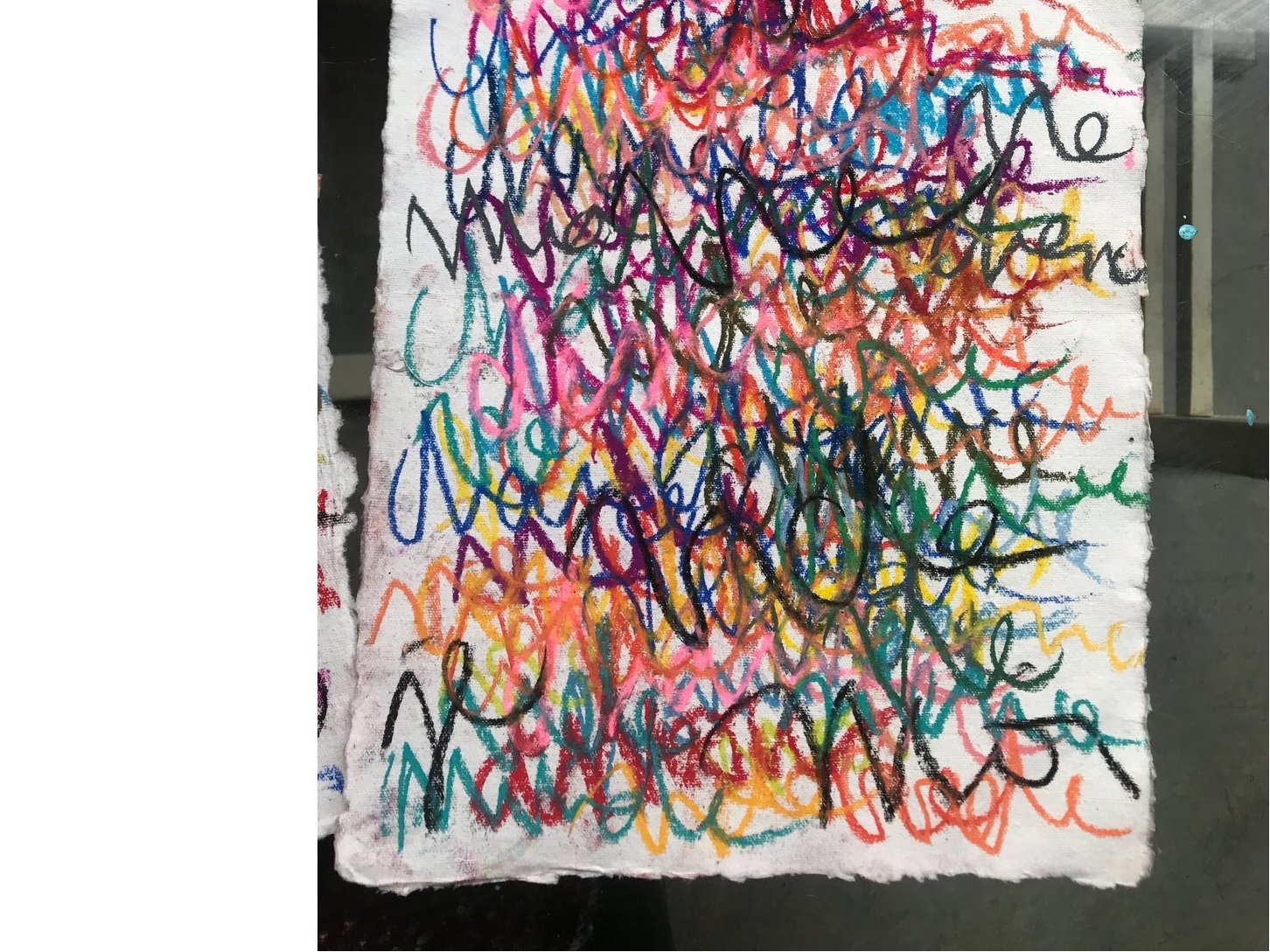 Aujourd’hui, c’est une étape importante, celle de retrouver les couleurs, papier, pastels, rendre les mots plus grands, qu’ils perdent leur sens, d’en faire jaillir d’autres cachés, au creux des feuilles, colorés. Ces écritures dessinées libèrent mon corps de mots et de formes de suprématie du langage. Ils sont aussi des espaces de transformation, de l’ombre à la lumière, et les mots y paraissent vivants, debout, réveillés, pleins, ils semblent même avoir un corps, un trajet, une trajectoire. C’est une ouverture, surprenante et généreuse.