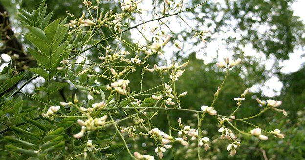 En logo, Feuilles et fleurs de Sophora du Japon (Styphnolobium japonicum) syn. (Sophora japonica), photo de Jean-Pol Grandmont.