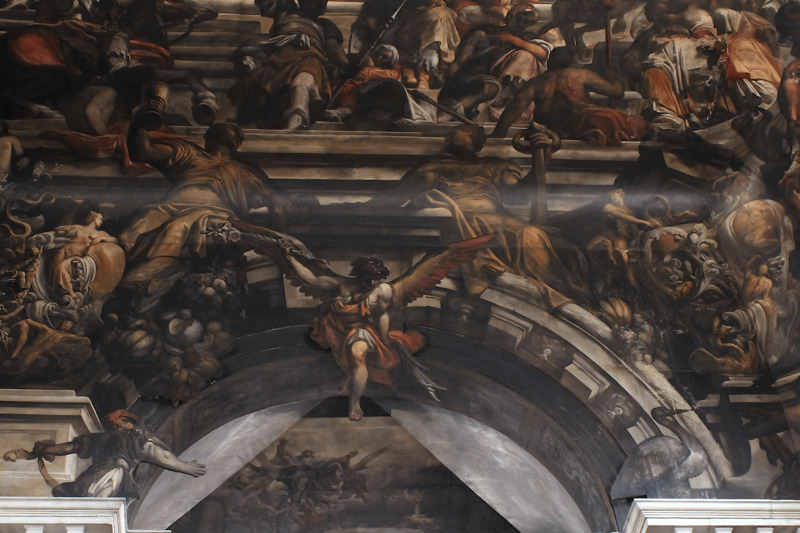 Pour le principal, Le martyre et l’apothéose de saint Pantaléon suit à la lettre le programme des voûtes italiennes aux raccourcis sévères. Une architecture de fausses colonnes montées sur de puissants stylobates et exécutées dans le style de la quadratura – procédé pictural illusionniste propre au baroque – étire la scène vers le point de fuite de la lumière céleste et donne l’impression que le toit de l’église dissimule une coupole percée d’un trou aspirant tout ce qui se trouve en dessous de lui. L’effet de vertige vers le haut est accentué par plusieurs incorrections dans l’exécution de la perspective – ainsi les contre-marches sont généralement deux à trois fois plus grandes que les marches (dans l’escalier, à la base des colonnes) – et par un certain nombre d’enjambements, pour emprunter le vocabulaire de la poésie, du plafond jusqu’au linteau des chapelles tout droit venus des plongées di sotto in sù des Quattrocento et Cinquecento, et qui lorgnent, comme c’était prévisible, du côté de la chapelle de Michel-Ange au Vatican et du Triomphe de la Divine Providence de Pietro da Cortona. Des planches de bois incurvées relient le plafond aux parois verticales, où des personnages représentés comme des « statues feintes » semblent prêts à basculer sur le spectateur : les douze apôtres, deux par deux, dans les pendentifs au-dessus des arcades menant aux chapelles ; les quatre vertus cardinales – Force, Tempérance, Justice, Prudence – aux angles de la contre-façade ; les trois vertus théologales – Espérance, Foi et Charité (doublée de l’Assistance aux malades pour occuper le dernier espace libre) – vers le presbytère. Tous ces particuliers regardent en bas pour ne pas être témoins de ce qui se passe au-dessus d’eux et partagent avec nous leur trouble et leur honte droit dans les yeux. Si nous sommes invités par le peintre à regarder la scène à la fois pathétique et triomphale qui s’étale devant nos yeux, ces personnages nous incitent à regarder entre nous et le plafond. Quelque part en l’air. À mi-chemin où se croisent notre regard et le leur.