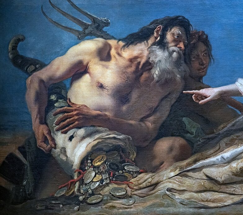 Au palais des Doges, on trouve sur la fin du parcours, après avoir traversé les Plombs dans les deux sens, une admirable Venise prosopopique recevant les hommages obséquieux du dieu Neptune (un autoportrait moral ?). Tiepolo y met en scène ces deux caractères humains préférés, on peut dire même obsessionnels : un vieillard empressé auprès d’une blonde atteinte de proptose thyroïdienne. C’est, assuré, le décollement de rétine. On peut noter à partir de là plusieurs choses.