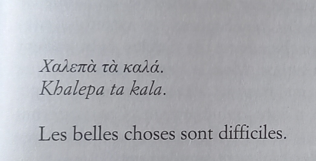Leçons de grec est un roman, une œuvre de fiction où différents personnages se côtoient, où il se passe des choses, où l’on peut même dire qu’il y a une intrigue. De ce point de vue, les attentes de la lectrice-lecteur seront en partie satisfaites, mais en partie seulement. Disons que s’ils redoutent la facilité à laquelle succombent nombre d’histoires, ils seront servis. C’est ce qu’on n’attend pas qui nous comble, et non ce qui est prévisible. Un des enjeux de ce texte consiste à nous faire sentir à partir d’une impossibilité ou d’une limite ce qui se tient derrière. Comment par le silence la matière du langage nous est donnée à toucher. Comment on peut rejoindre des sensations que l’on n’a jamais éprouvées, qui appartiennent à d’autres corps que le nôtre, par le « simple » moyen des mots subtilement agencés. Comment des « phrases inconnues » nous initient à l’inconnu. Comment un aveugle voit le monde, comment il l’entend.