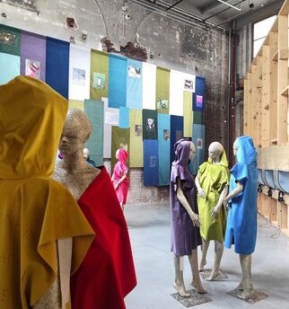 vers une forme d’isoloir éclairé par une boule à facettes.