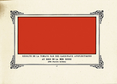 « Paru chez Ollendorf en 1897 sous le titre Album Primo-avrilesque, il est au format In-16° oblong (dit “à l’italienne”), de 24 x 16 cm) et comprend sept aplats monochromes de 14,5 x 7 cm chacun : noir, bleu, vert, jaune, rouge, gris, blanc, suivi de La marche funèbre. Cet ouvrage bibliophilique, au tirage très restreint, a été très peu vu, sauf par certains des grands passeurs du XXe siècle (on en trouve l’édition originale, par exemple, dans la bibliothèque d’André Breton). » Marc Partouche.