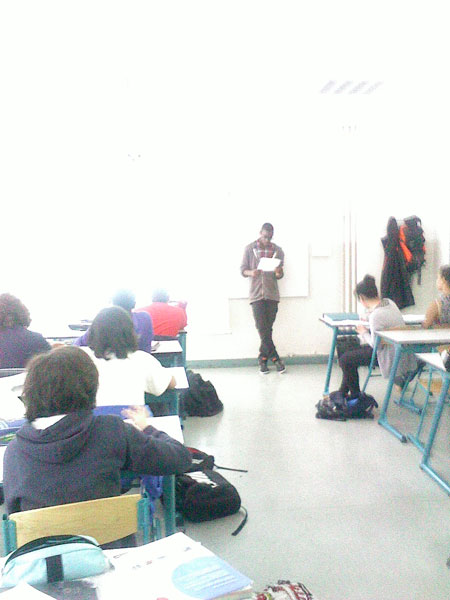 Namori me montre, quand la sonnerie retentit, un grand cahier rempli de poèmes qu’il écrit depuis longtemps. Namori qui me remerciera plus tard lors d’un envoi de texte oublié pour ce "projet" d’atelier d’écriture avec eux. Il lisait aussi les textes de ses camarades plus timides.