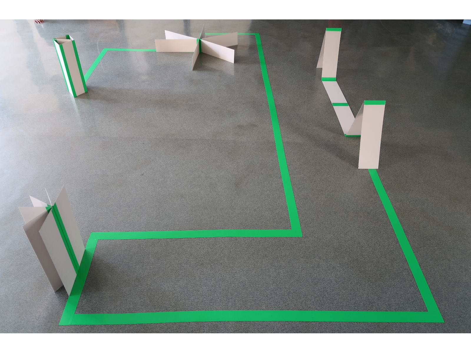 Après un premier atelier où les enfants travaillent autour des livres sur les positions et les mouvements dans l’espace, ils sont amenés ici à travailler sur les parcours. Expérience corporelle en traçant au sol un parcours avec de l’adhésif, parcours ponctué par des livres qui induisent un mouvement pour le corps. Puis traduction graphique.