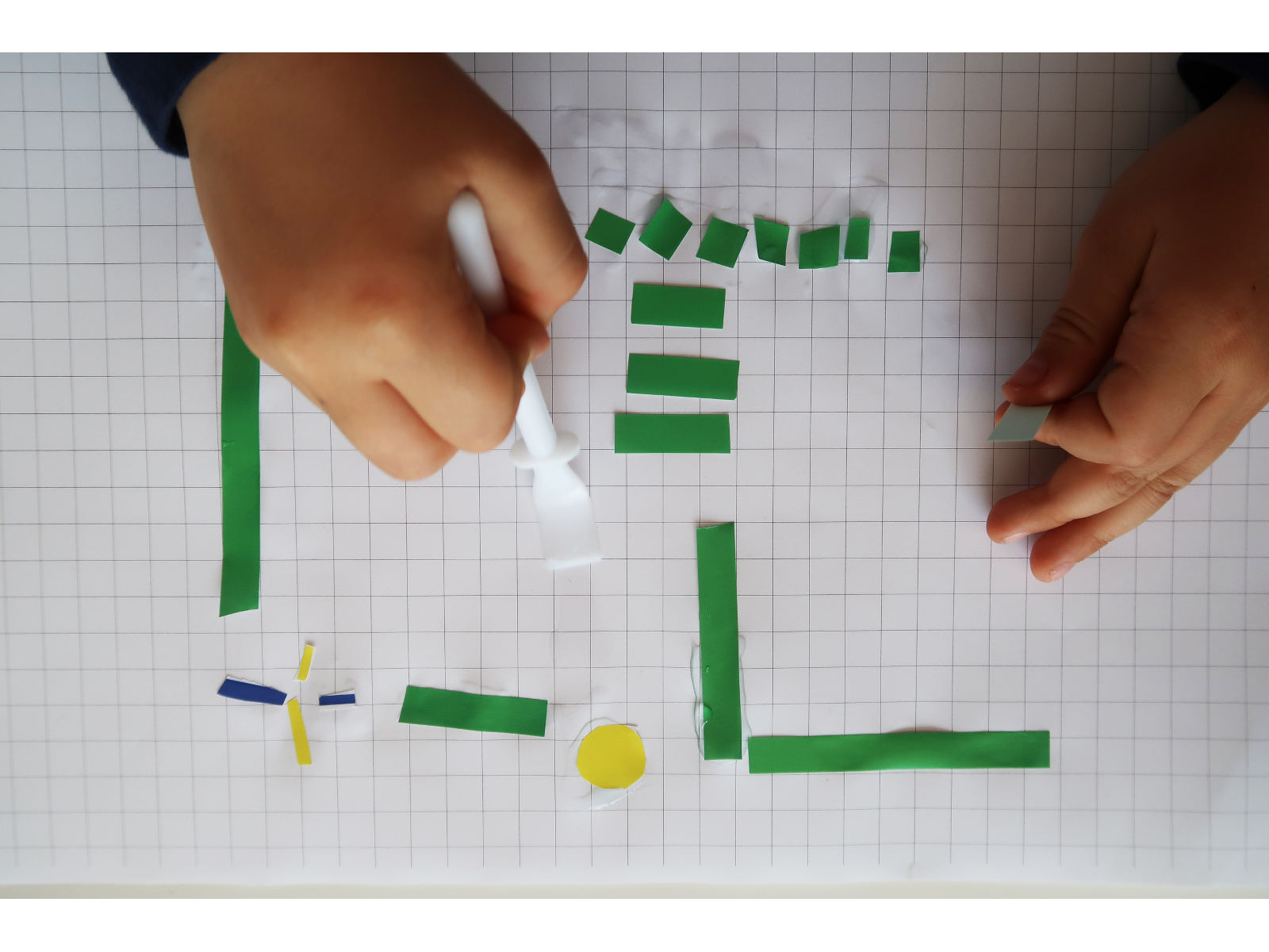 Travail sur la trame, le repérage dans l’espace grâce à une grille (espace vécu et espace papier).