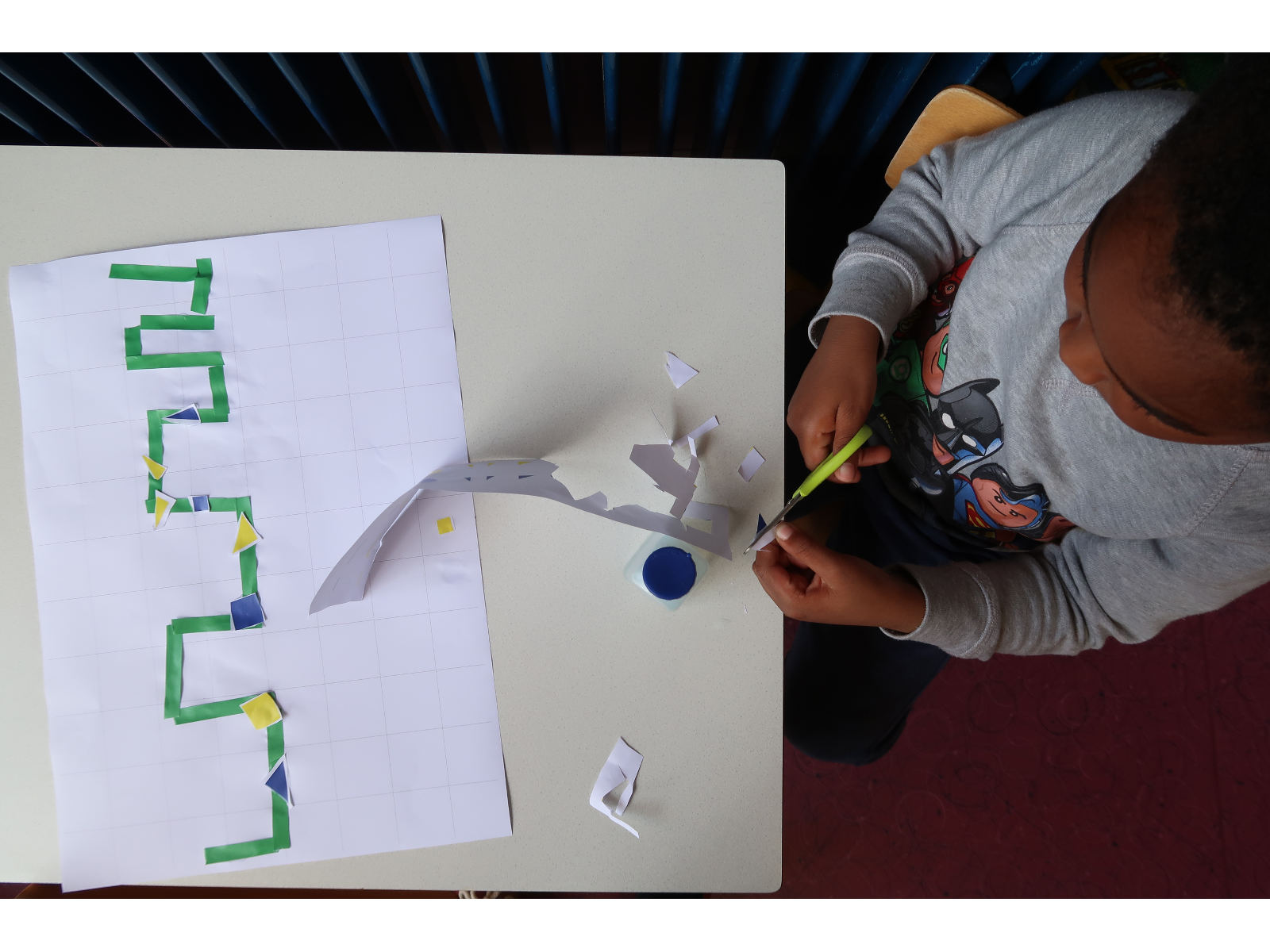 / atelier de création graphique : chaque enfant reproduit graphiquement le parcours vécu dans l’espace
