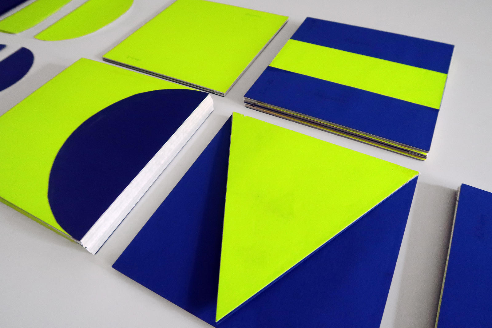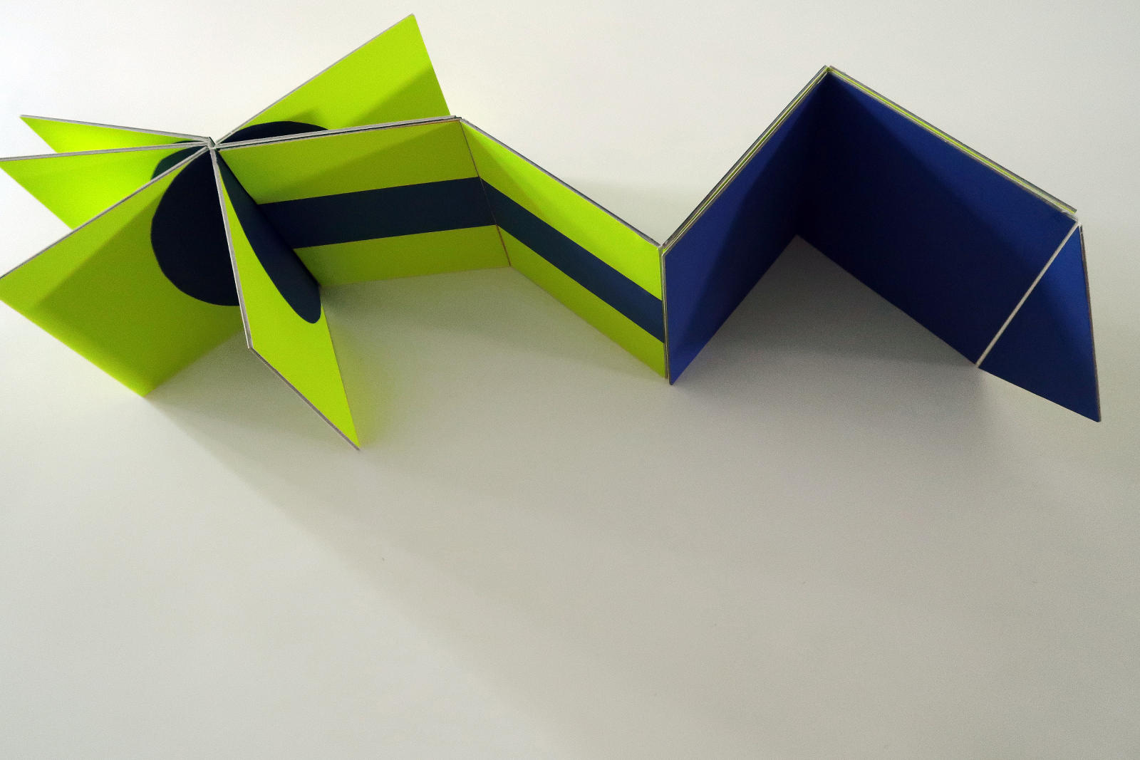 Après avoir créé un langage autour de l’espace par des pictogrammes racontant des positions ou des mouvements, et qui assemblés, peuvent raconter des parcours, les pictogrammes, assemblages de formes en deux dimensions, se transforment en livres, racontant l’espace en volume.