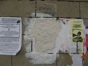 Dans le mur du Barbizon a été creusé un trou irrégulier de la largeur d’une grande assiette, les alvéoles dans l’épaisseur de la brique font penser à des habitacles animaux, ruche ou coquillage, et là ont été déposées des tracts d’informations. Pour le cas où on hésiterait, une inscription sur le mur : SERVEZ-VOUS. Ça fait une bonne semaine que ça n’évolue pas, je me demande ce qu’ils attendent – soit d’un côté  pour agrandir le trou, soit de l’autre pour le colmater.