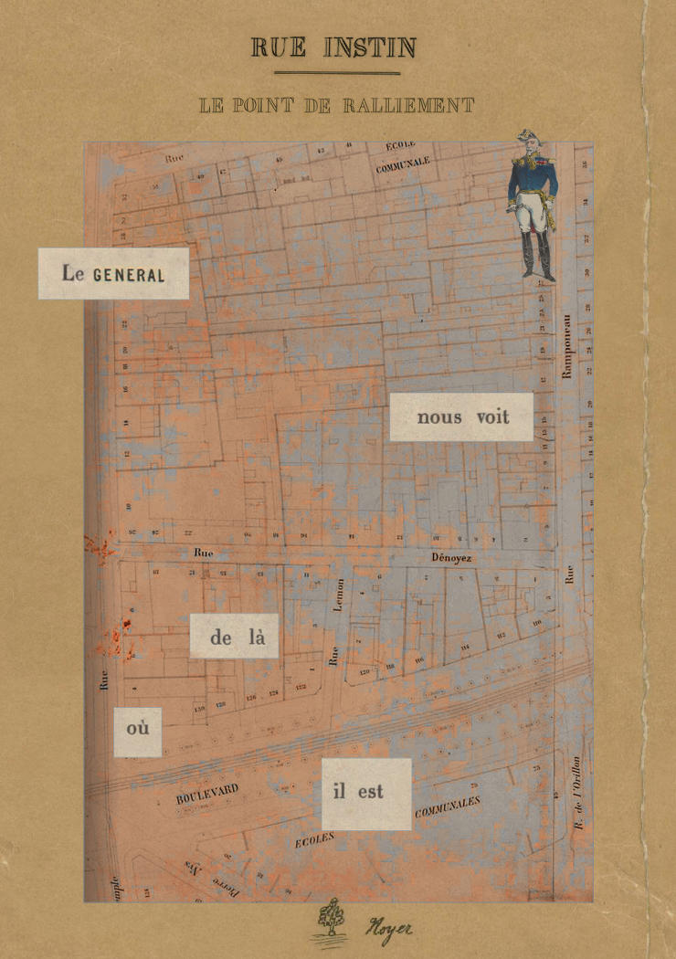 Écrit et fabrique des images, développe un travail de collage associant documents géographiques et fragments de textes.