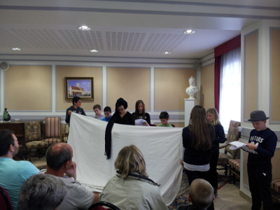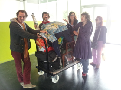 Nous travaillons toute la matinée dans la salle multimédia. Agnès Proust, Félix Pruvost, Thomas Coux, Talou Calvet, Axel Bry, Anne Leblanc, Pascale Maillet, sept comédiens, chanteurs, sept complices pour m’accompagner et encadrer cette soirée qui se prépare et au cours de laquelle une trentaine d’élèves va lire des textes écrits en atelier et jouer des extraits de scènes. Les comédiens arrivent vers 8h30, poussant devant eux un charriot surchargé de décors et d’accessoires : de vrais saltimbanques !