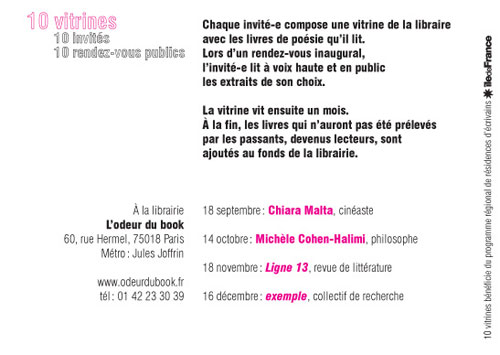 Son projet de résidence  est intitulé 10 vitrines. Chaque invité-e compose une vitrine de la libraire avec les livres de poésie qu’il lit. Lors d’un rendez-vous inaugural, l’invité-e lit à voix haute et en public les extraits de son choix. La vitrine vit ensuite un mois. À la fin, les livres qui n’auront pas été prélevés par les passants, devenus lecteurs, sont ajoutés au fonds de la libraire.
