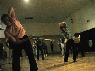 Franck Micheletti, de la compagnie Kubilaï-Khan-investigations nous fait entrer dans la danse : nos corps se déplient « là-bas » (You !), se replient « ici » (Me !), nos pieds touchent littéralement le sol, puis latéralement une jambe ( si c’est le genou, nous aurons des bleus), la hanche, l’épaule : « ici », nous nous replions, « là-bas » nous nous déplions.