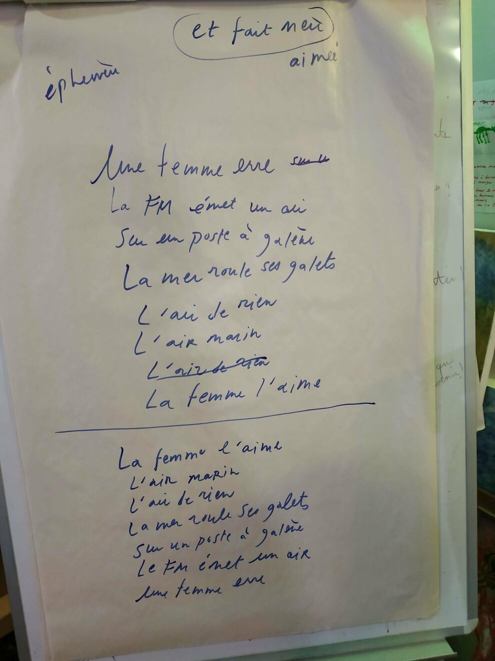 Nous avons le plaisir de retrouver Fatoumata, Nadia et Nacera. Yann a apporté des gâteaux et nous nous asseyons autour de la table. Nous débutons par les « invitation à » et les « prière de » pour nourrir les petits mots piochés au hasard à la médiathèque Parmentier. Pour poursuivre le thème de l’éphémère, Yann nous propose de travailler sur des poèmes uniquement composés de lettres ou de chiffres. Éphémère devient ainsi FMR. Tâche ardue, nous parvenons tout de même à deux poèmes. Puis, chacune et chacun écrit un texte sur ce même thème. Nacera évoque ses parents qu’elle n’a jamais connus, Rachid la voix de sa présentatrice radio préférée et M. Sakraoui, après avoir parlé des guinguettes, raconte ce qu’il vécut le 17 octobre 1961 à Paris.