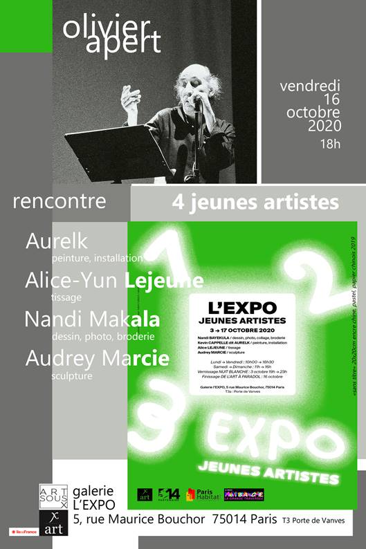 A l’occasion du finissage de l’exposition "4 jeunes artistes" retenus par art-sous-x, Olivier Apert rencontre Aurelk, Alice-Yun Lejeune, Nandi Makala, Audrey Marcie. Cette rencontre fera l’objet d’une captation où les jeunes artistes parleront de leurs travaux, de leurs relations au quartier de la Porte de Vanves (cette exposition ayant pour thème : "un quartier, des histoires") ainsi que la création d’une bande sonore par Olivier Apert.