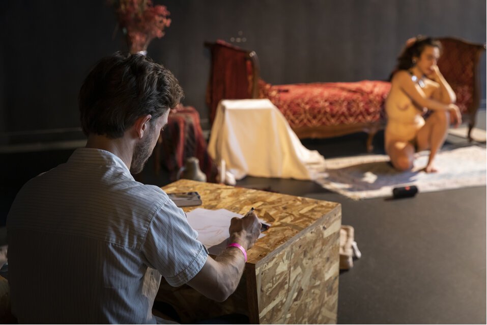 Journal de ma peau mêle des textes de poésie, des récits de mes séances de modèle vivant, des poses immobiles, telle une séance de modèle vivant, mais de façon performative. Les spectateurs sont d’ailleurs encouragés à dessiner (ou écrire ou créer de la façon qu’ils souhaitent). L’idée est d’amener le corps nu, offert, immobile, créateur, en dehors du cadre du modèle vivant, pour partager mes prises de conscience et la poésie qui est née depuis que je pose.