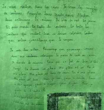 Je triture. Je façonne des bouts de tissus bouillis pour en éliminer les polymères de trouille. Savais-tu que la peur on peut la faire bouillir à 30 ? Je serre les poings à fond, en crispé relâché, je me mets à mon tour à inscrire des couleurs dans tes cases sans contours. Parce qu’avec toi j’ai confiance et je n’ai plus besoin de formes descriptibles. Ça c’est le maintien de l’ordre.