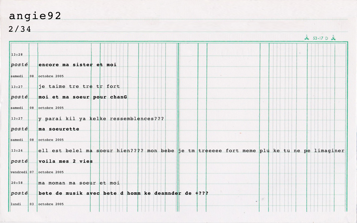 Relire ces blogs oubliés par quelques jeunes filles du 92, depuis 2002 et l’apparition de ces journaux intimes noyés aujourd’hui dans ce world wide web et leurs mots de passe perdus, d’une mémoire juvénile, de leurs écrits adolescents, leurs cris et amours, jeux et souffrances parfois.